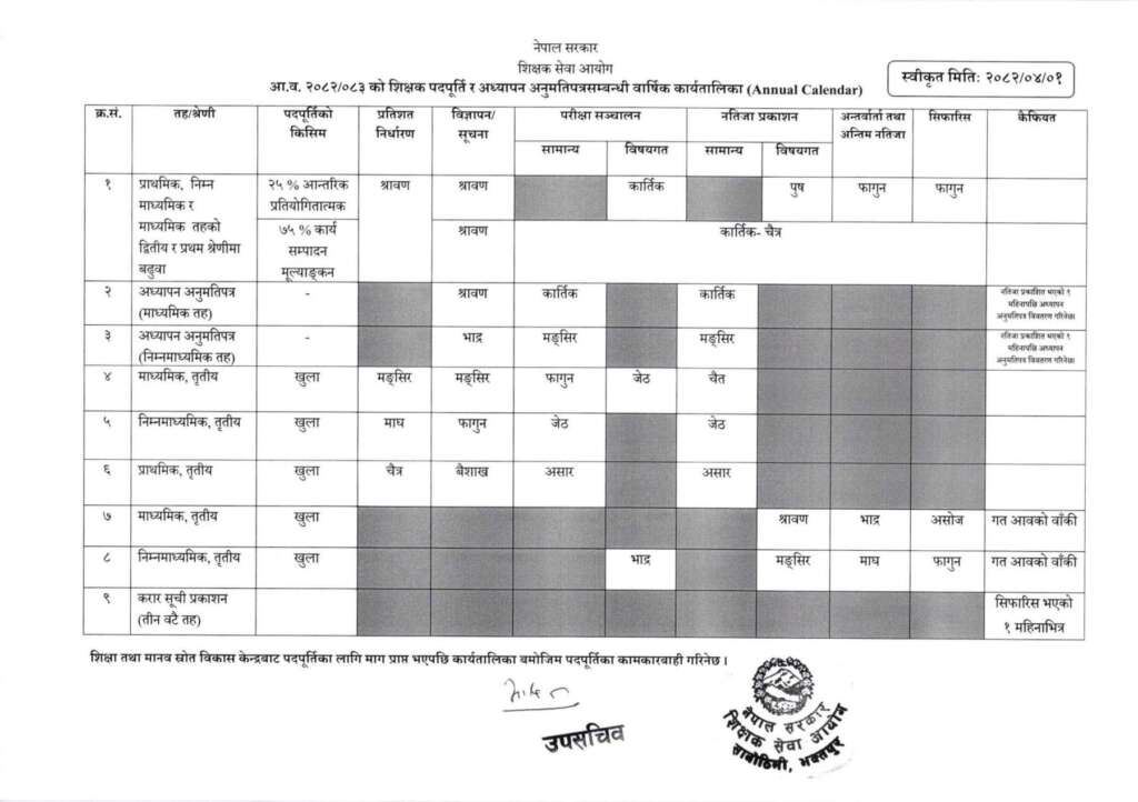 शिक्षक सेवा आयोगको वार्षिक कार्यतालिका (क्यालेन्डर) 2082/2083
