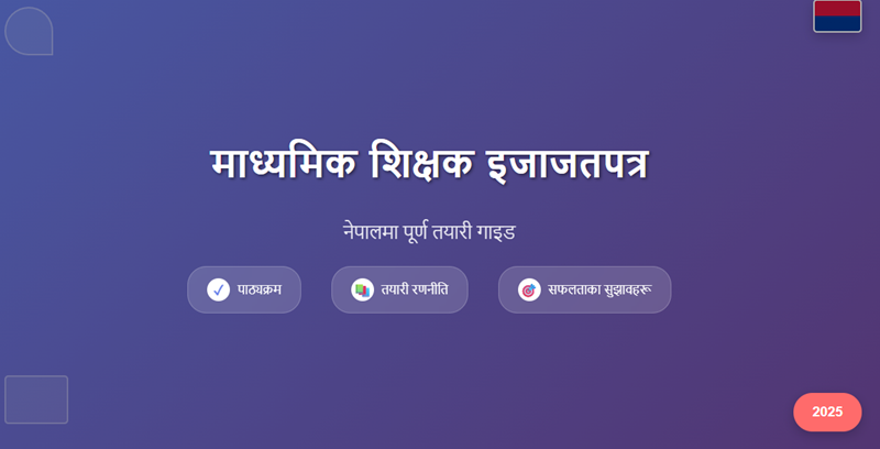 नेपालमा माध्यमिक शिक्षक इजाजतपत्र परीक्षाको तयारी गर्नका लागि पूर्ण गाइड। योग्यता, पाठ्यक्रम, तयारी रणनीति र सफलताका टिप्सहरू सहित २०२५ को लागि अपडेटेड जानकारी।